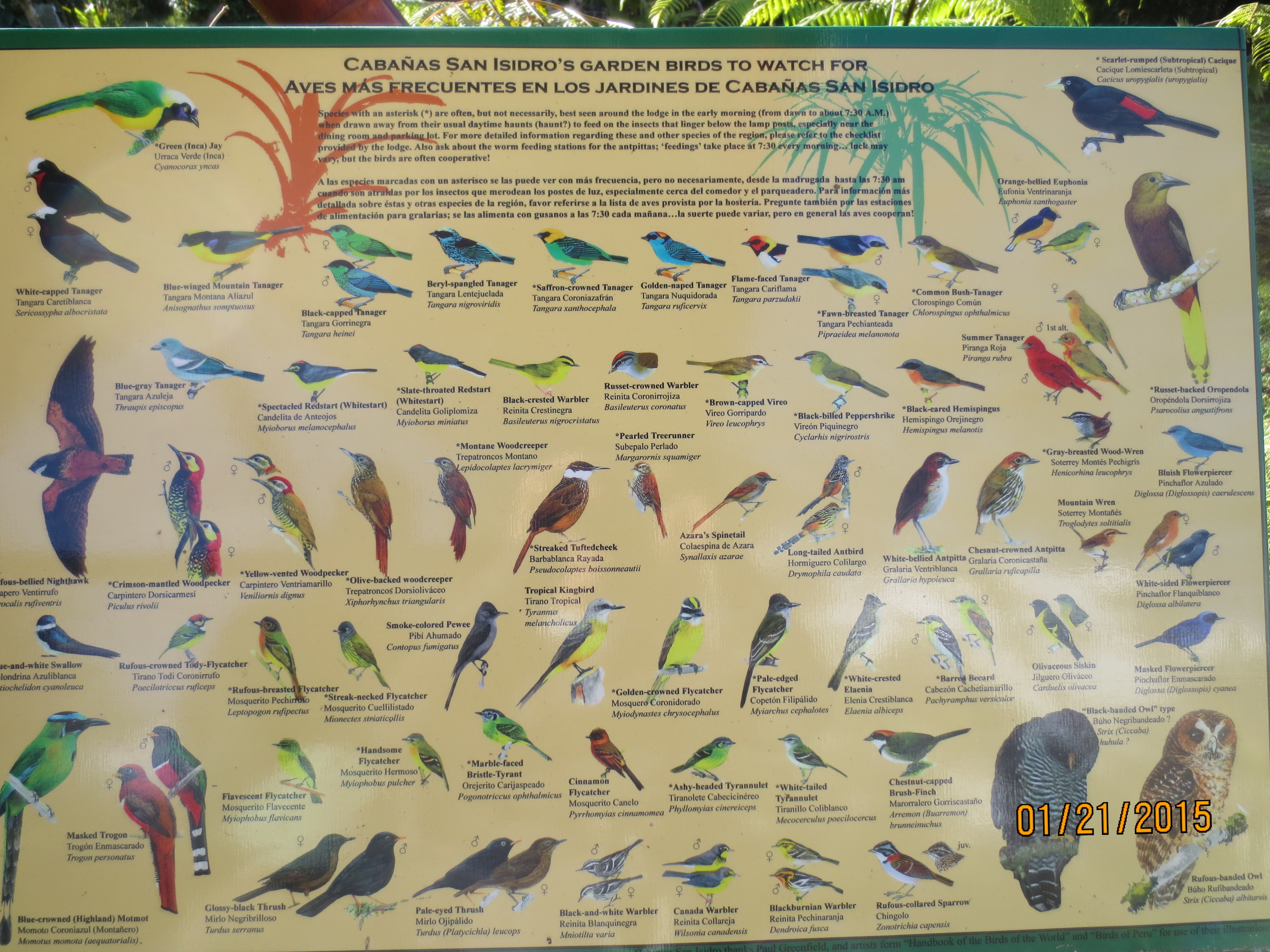 After a couple more stops and as many lifers, we gather in the San Isidro dining hall for a final tally of the list, and bid farewell to Mauricio. He had been hired to drive and guide us by Carmen Bustamante, one of the owners of Guango and San Isidro. Actually, she helped us plan and made arrangements for our whole trip.